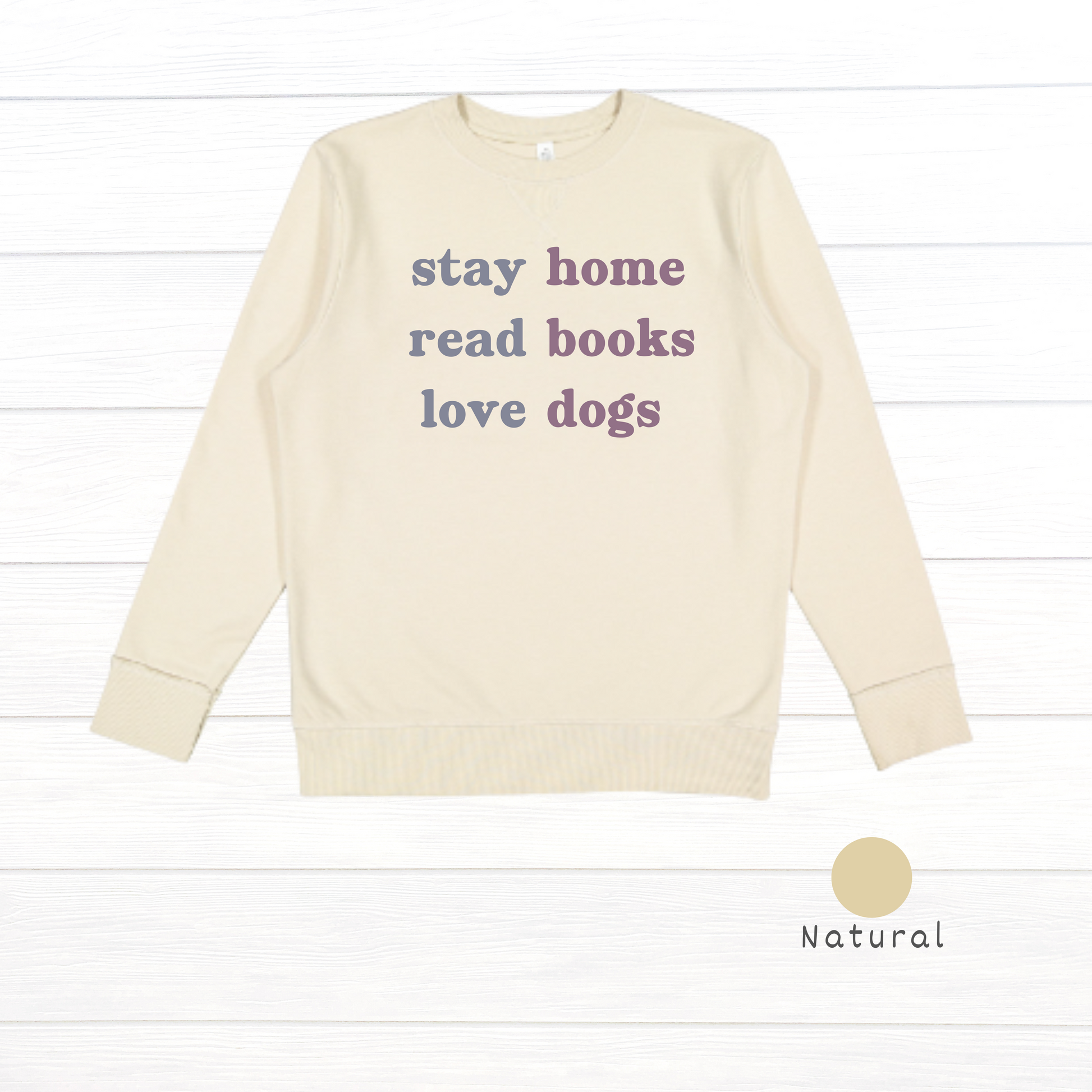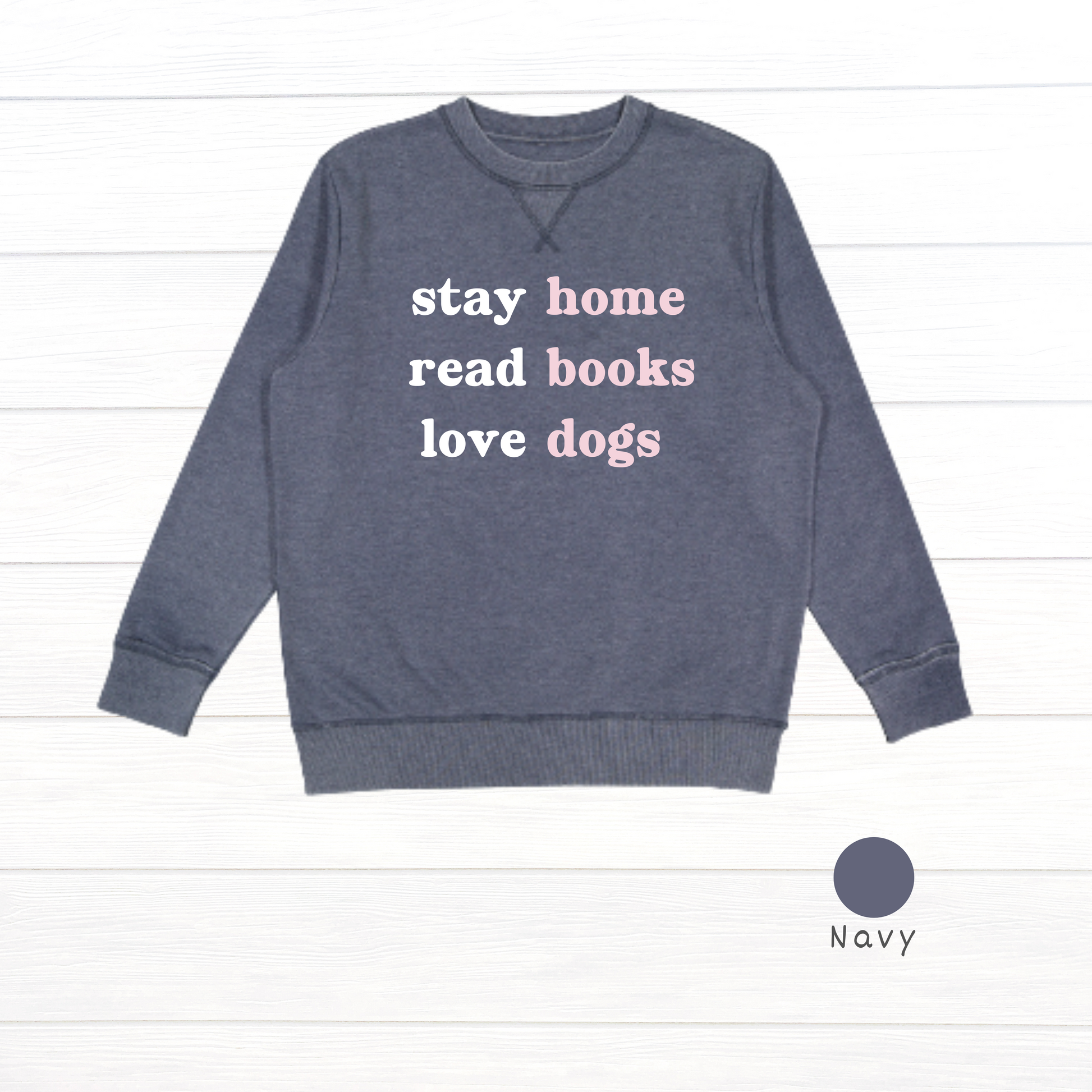 Embrace cozy days with the Stay Home. Read Books. Love Dogs. Live and Tell Vintage Wash Fleece Sweatshirt. This soft, worn-in fleece is perfect for curling up with your favorite novel and furry friend. Its vintage wash adds a relaxed vibe, making comfort and whimsy your new everyday essentials.